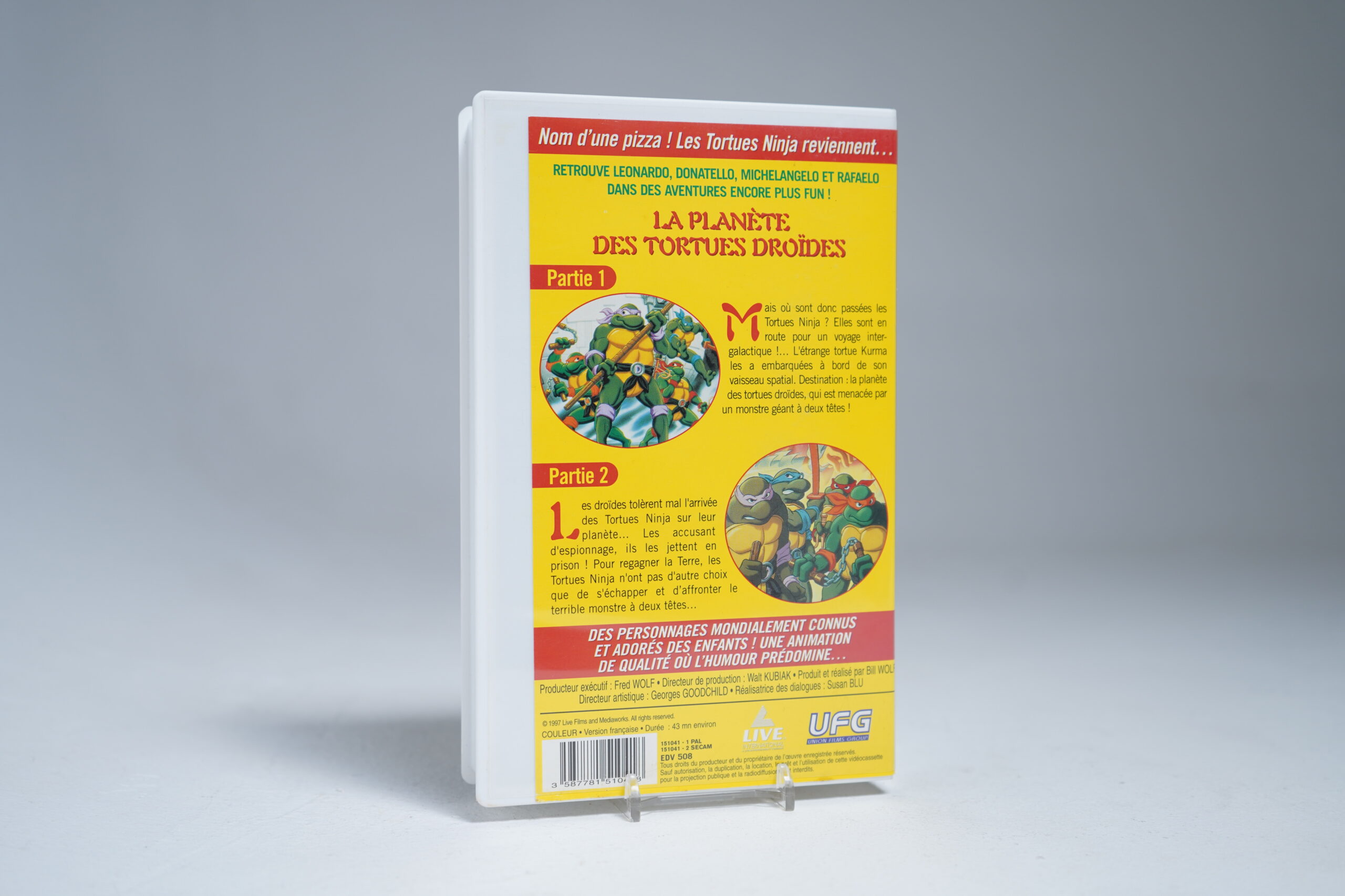 French language VHS tape of the animated Teenage Mutant Ninja Turtles episode. 43 minutes runtime, 100% original release by Live Films.